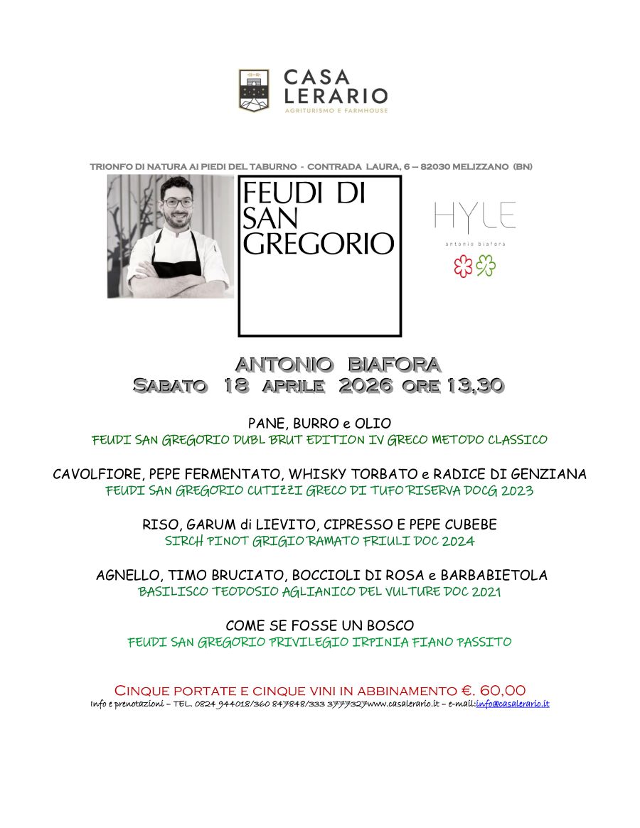 Da oltre dieci anni Casa Lerario organizza pranzi d’autore con rinomati chef provenienti da tutta Italia. Nella cucina della farmhouse sannita, solitamente regno della patronne Tatiana Bruno Lerario, sono passati nomi del calibro di Eduardo Estatico, Cristian Torsiello, Luca Abbruzzino, Angelo Sabatelli, Christoph Bob, Salvatore Tassa e Alfio Ghezzi.