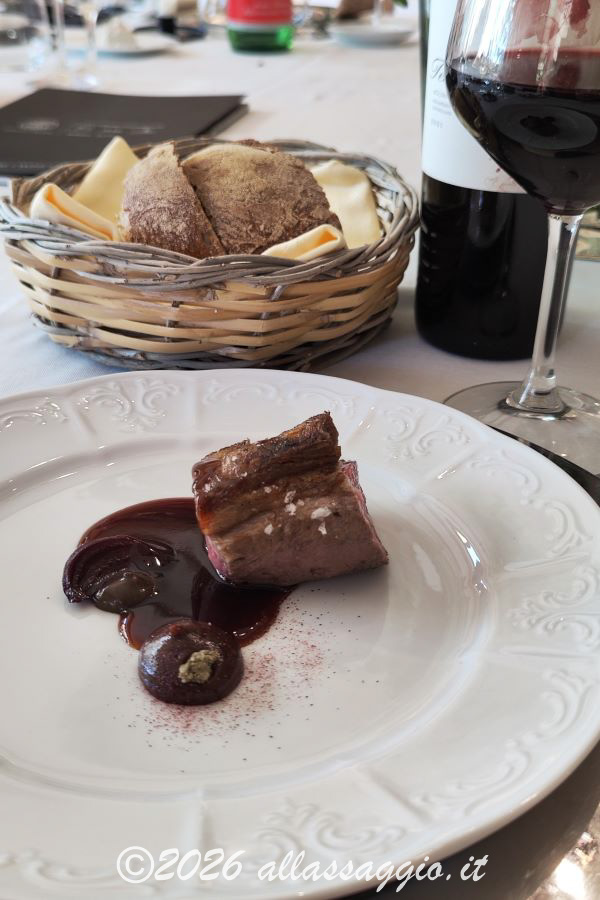 L’agnello, servito con cottura media e interno rosa, è accompagnato da timo bruciato, boccioli di rosa e barbabietola.