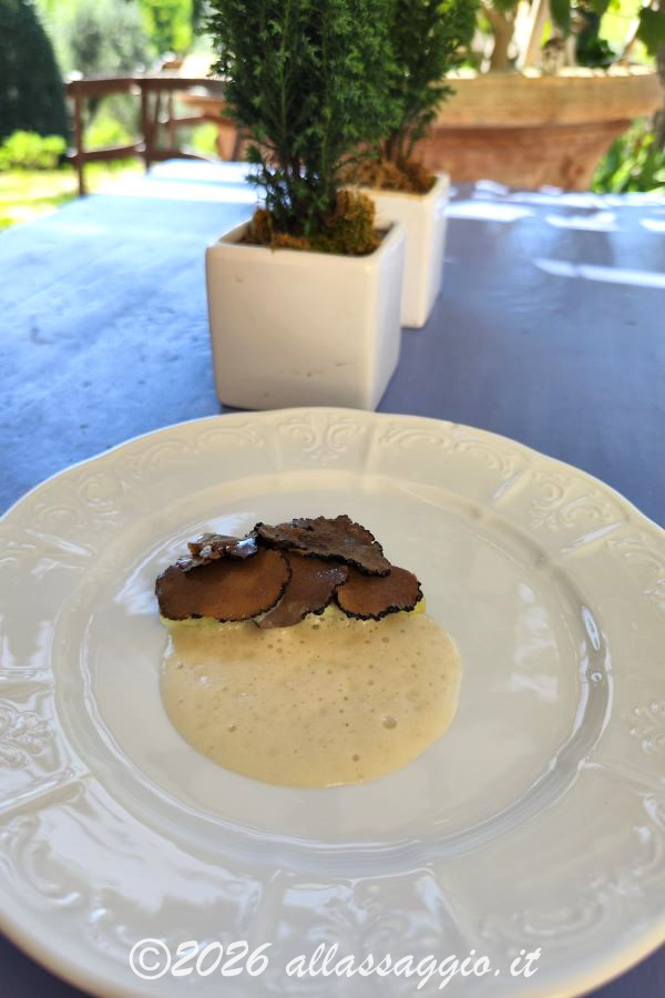 Come alternativa vegetale, Sfoglia di patata Agria dell’altopiano della Sila, ragù di topinambur, spuma di Cipolla Bianca di Castrovillari e tartufo. Ancora Calabria, ancora un legame viscerale con la terra e i suoi ingredienti.