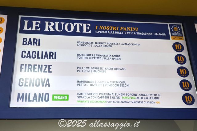 Inoltre ci sono le Ruote, che sono 10 come quelle del lotto. A ogni ruota corrisponde un panino, ispirato alle tradizioni gastronomiche di quella città o regione, con ortaggi e verdure sempre di stagione. Ad esempio, nel “N4poli” il protagonista è l’hamburger di salsiccia, nel “Roma” c’è la porchetta, nel “Palermo” il tonno panato nel mais, nel “Venezia” c’è il baccalà.