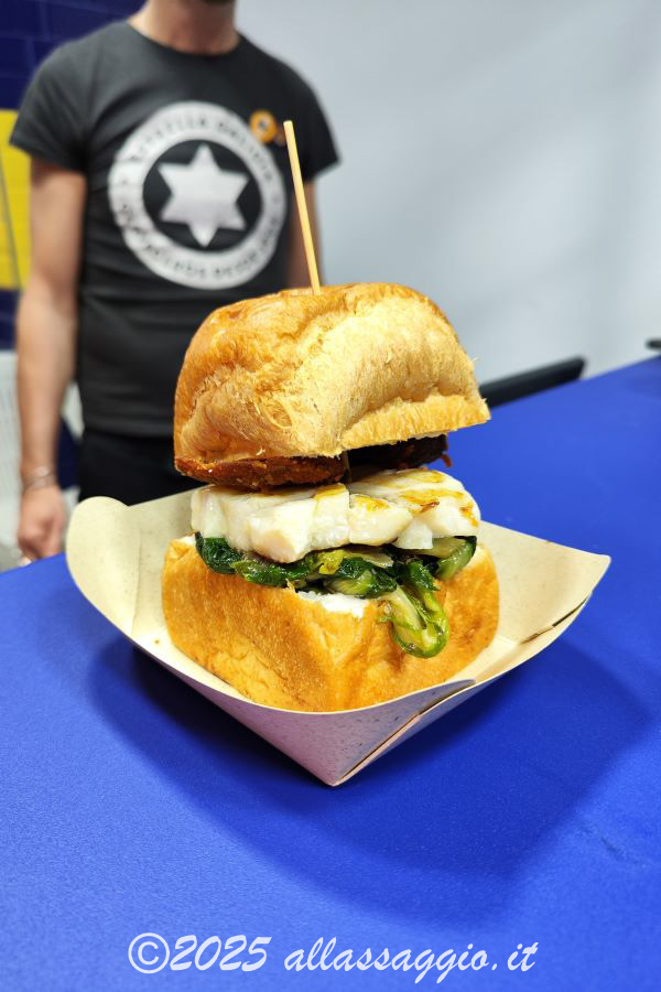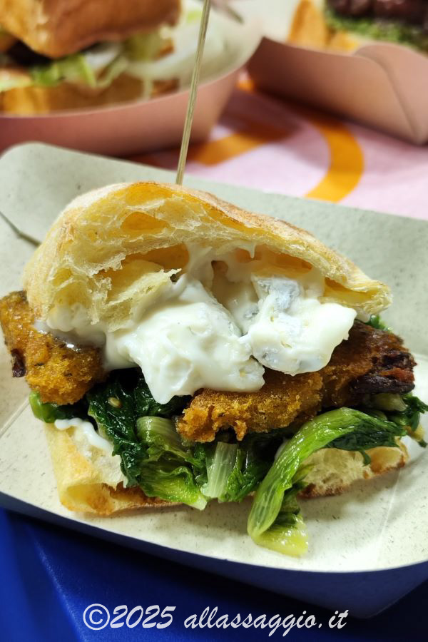 “Milano” è il panino vegan/veggie, nel quale il burger è fatto di polenta ai funghi. Nella versione vegana, è abbinato a scarola cruda e cotta con capperi e olive; nella versione vegetariana, è abbinato a gorgonzola e maionese classica. A noi sono piaciute molto entrambe le versioni.