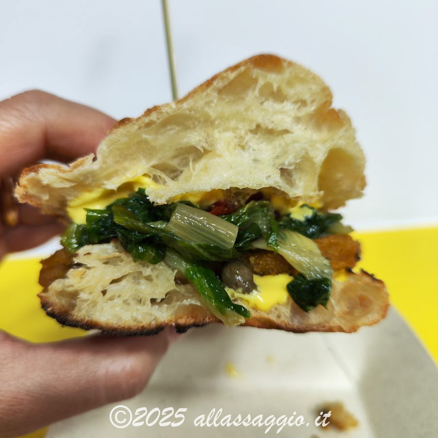 “Milano” è il panino vegan/veggie, nel quale il burger è fatto di polenta ai funghi. Nella versione vegana, è abbinato a scarola cruda e cotta con capperi e olive; nella versione vegetariana, è abbinato a gorgonzola e maionese classica. A noi sono piaciute molto entrambe le versioni.