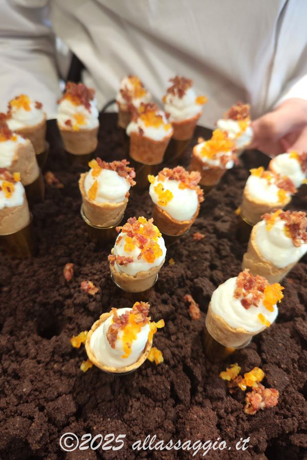 Quarta e ultima preparazione dello chef, Cono con mousse di ricotta di bufala, arancia candita e bacon croccante, un riuscito gioco di contrasti, sapientemente calibrato tra dolcezza e sapidità, morbidezza e croccantezza.