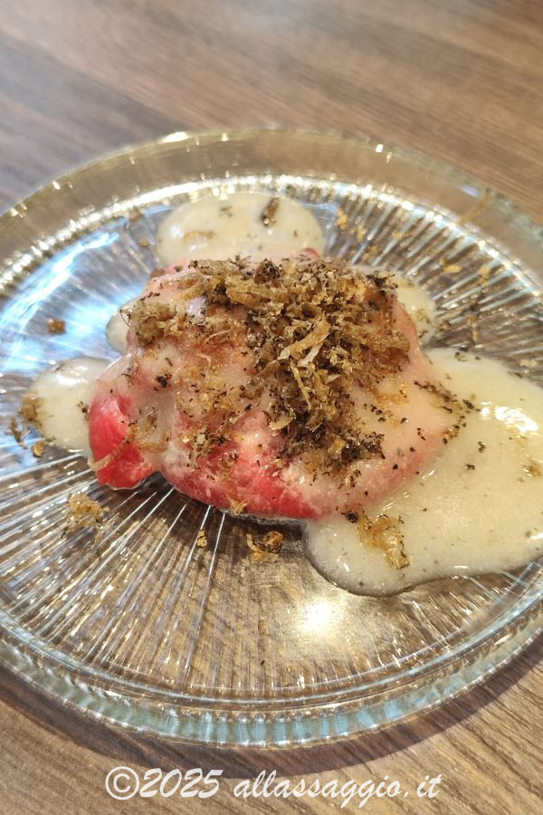 Nel secondo piatto, Carpaccio di bufalo con colatura di provola, foie gras e tartufo nero, il sentore affumicato della provola dialoga con quello ricco e deciso del foie gras e con la nota terrosa del tartufo.