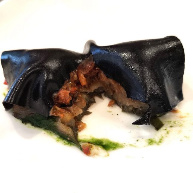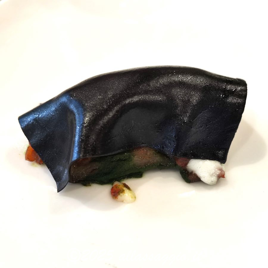 La parte meno nobile della melanzana, la buccia, in questo piatto viene esaltata e trasformata in un velo attraverso un processo lungo e laborioso, andando a ricoprire la parmigiana quasi fosse un’alga nori.