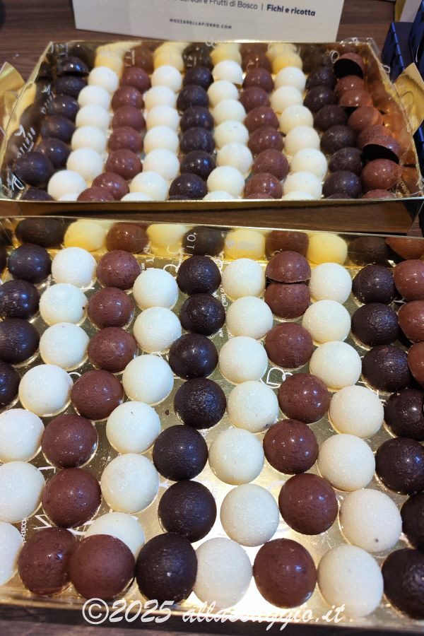 Classici invece i tre gusti delle praline: cioccolato bianco, cioccolato al latte e cioccolato fondente.