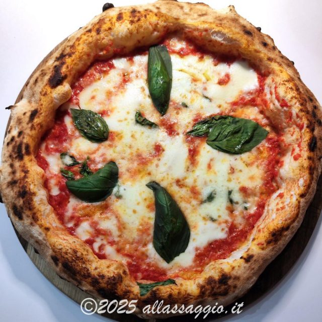 L’impasto della pizza, ottenuto con prefermento anziché con impasto diretto, è piuttosto neutro e poco salato, e invoglia a un morso dopo l’altro.