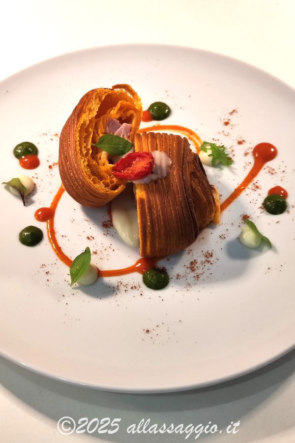 Te lo ricordi il voulevant? (pasta sfoglia al burro, cremoso di mozzarella di bufala, pomodorino candito e pesto leggero di basilico) e Pain suisse sfogliato al cioccolato ripieno di finta genovese napoletana (doppia sfoglia lievitata e profumata al cioccolato fondente 55% selezione Valrhona, cipolla ramata stufata alla soia, cremoso di Pecorino Romano DOP scorza nera)