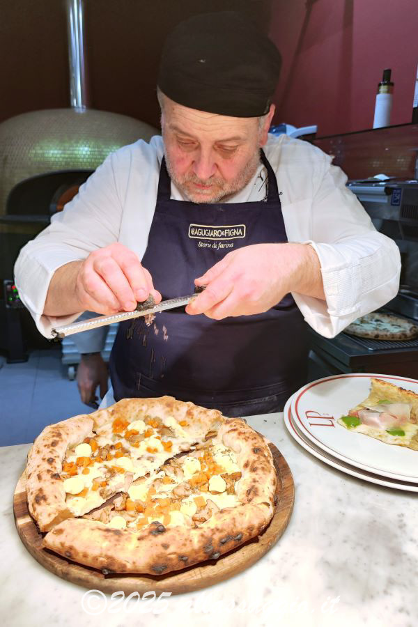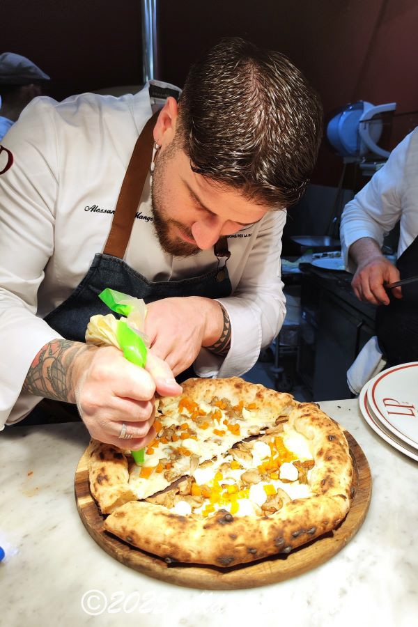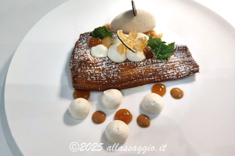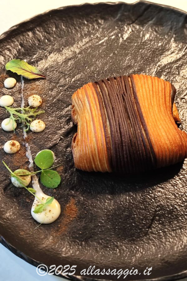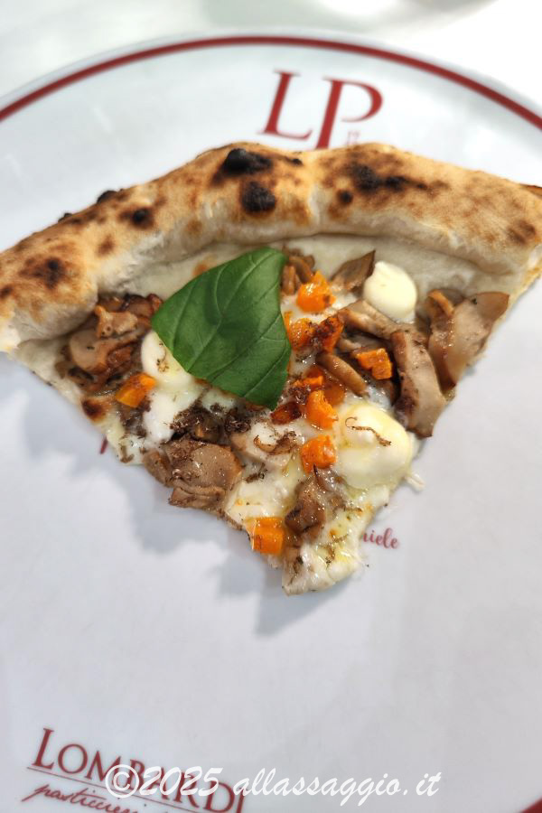 L’impasto pizza sfogliato al burro è una preparazione davvero unica. Altrettanto sorprendente l’abbinamento degli ingredienti, che sulla carta sembravano inconciliabili e invece funzionano benissimo insieme. Ottimo anche il pairing con IGT Benevento Falanghina passito “Laureto” 2024 – La Guardiense, la cui acidità attenua la dolcezza e impedisce al vino di risultare stucchevole.