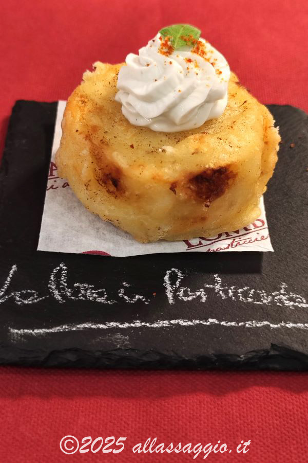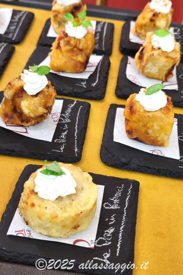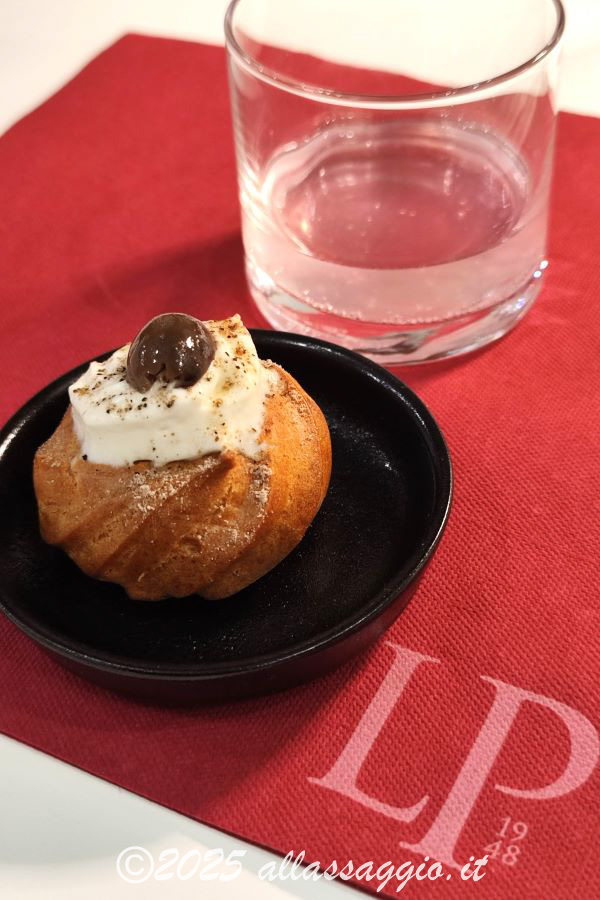 L’amuse bouche, Zeppolina di Santa Lucia servita con acqua aromatizzata agli agrumi e fiori di hibiscus, è stata presentata in due varianti: per gli onnivori con chantilly di acciughe del mar Cantabrico, per i vegetariani con chantilly al Parmigiano Reggiano DOP 24 mesi.