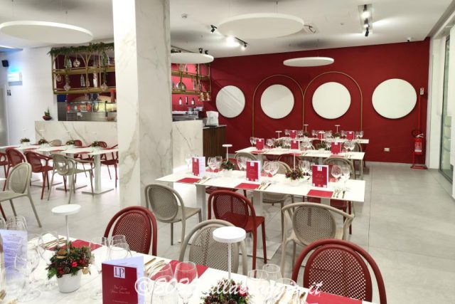 A caratterizzare l’ambiente è un rosso profondo e intenso, colore identitario del progetto, che ritorna sulle pareti, nel logo e in diversi elementi d’arredo, creando un’atmosfera decisa e riconoscibile.