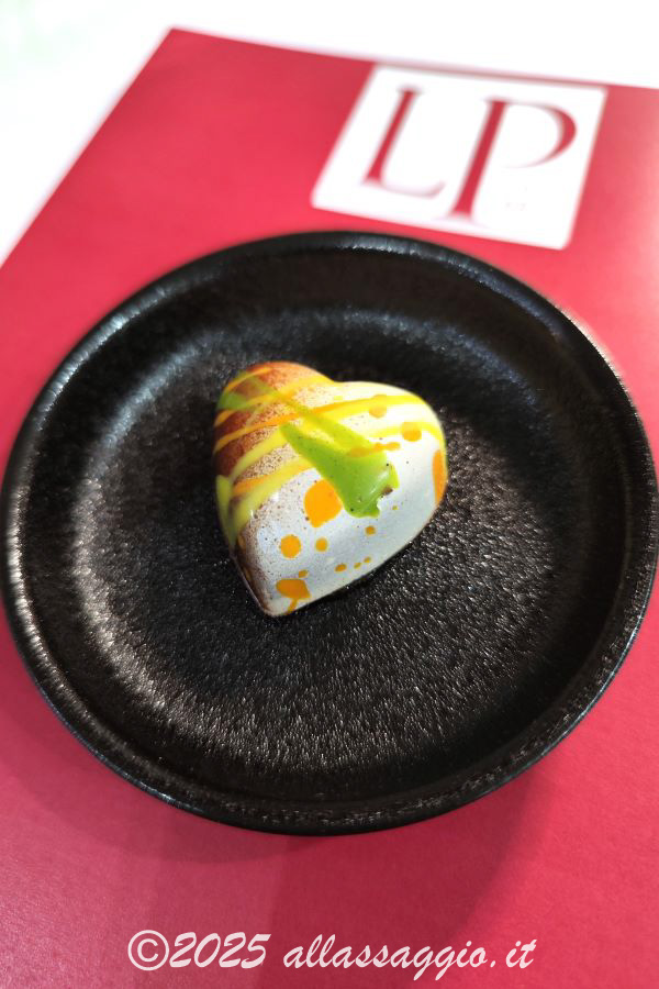 Come Predessert, Pralina di cioccolato fondente al 55% selezione Valrhona con ganache alla menta, albicocca candita e profumo di lime.