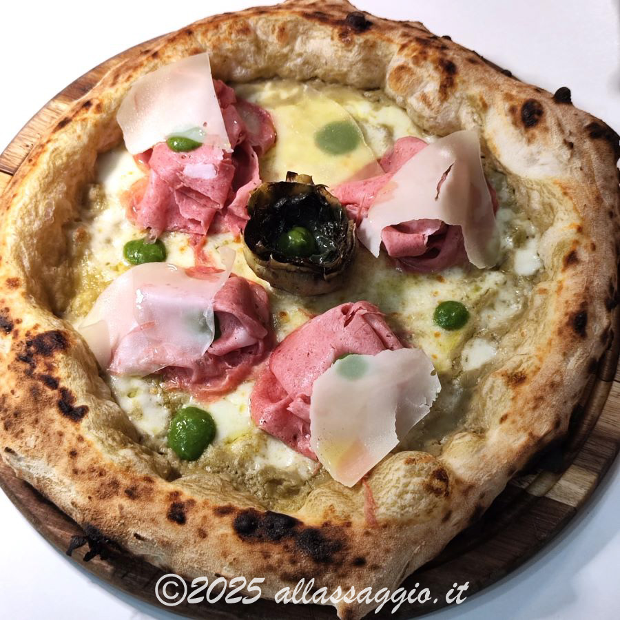 L’impasto della pizza, ottenuto con prefermento anziché con impasto diretto, è piuttosto neutro e poco salato, e invoglia a un morso dopo l’altro.