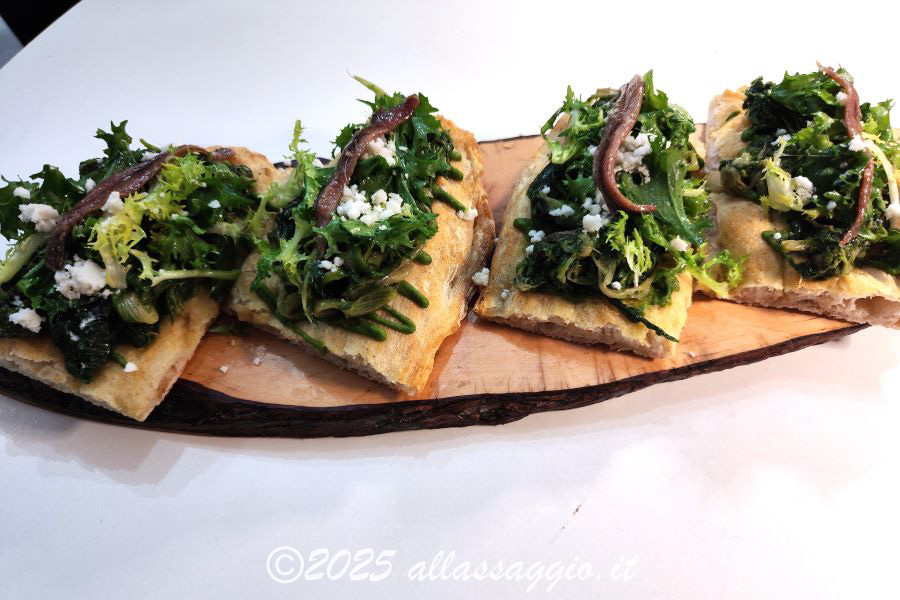 Pala a fermentazione spontanea “Assoluto di scarola”: Crema di scarola al naturale, scarola ripassata in padella con olive caiazzane e capperi di pantelleria IGP az. agricola La nicchia, julienne di scarolina riccia croccante, neve di pinoli e acciughe del mar Cantabrico, olio evo monocultivar peranzana Oleificio Roccia