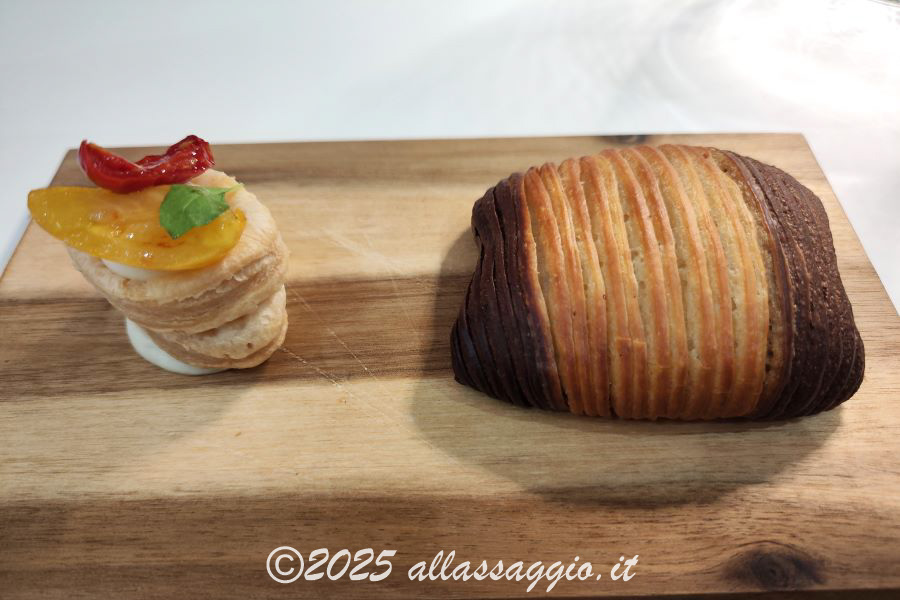Te lo ricordi il voulevant? (pasta sfoglia al burro, cremoso di mozzarella di bufala, pomodorino candito e pesto leggero di basilico) e Pain suisse sfogliato al cioccolato ripieno di finta genovese napoletana (doppia sfoglia lievitata e profumata al cioccolato fondente 55% selezione Valrhona, cipolla ramata stufata alla soia, cremoso di Pecorino Romano DOP scorza nera)